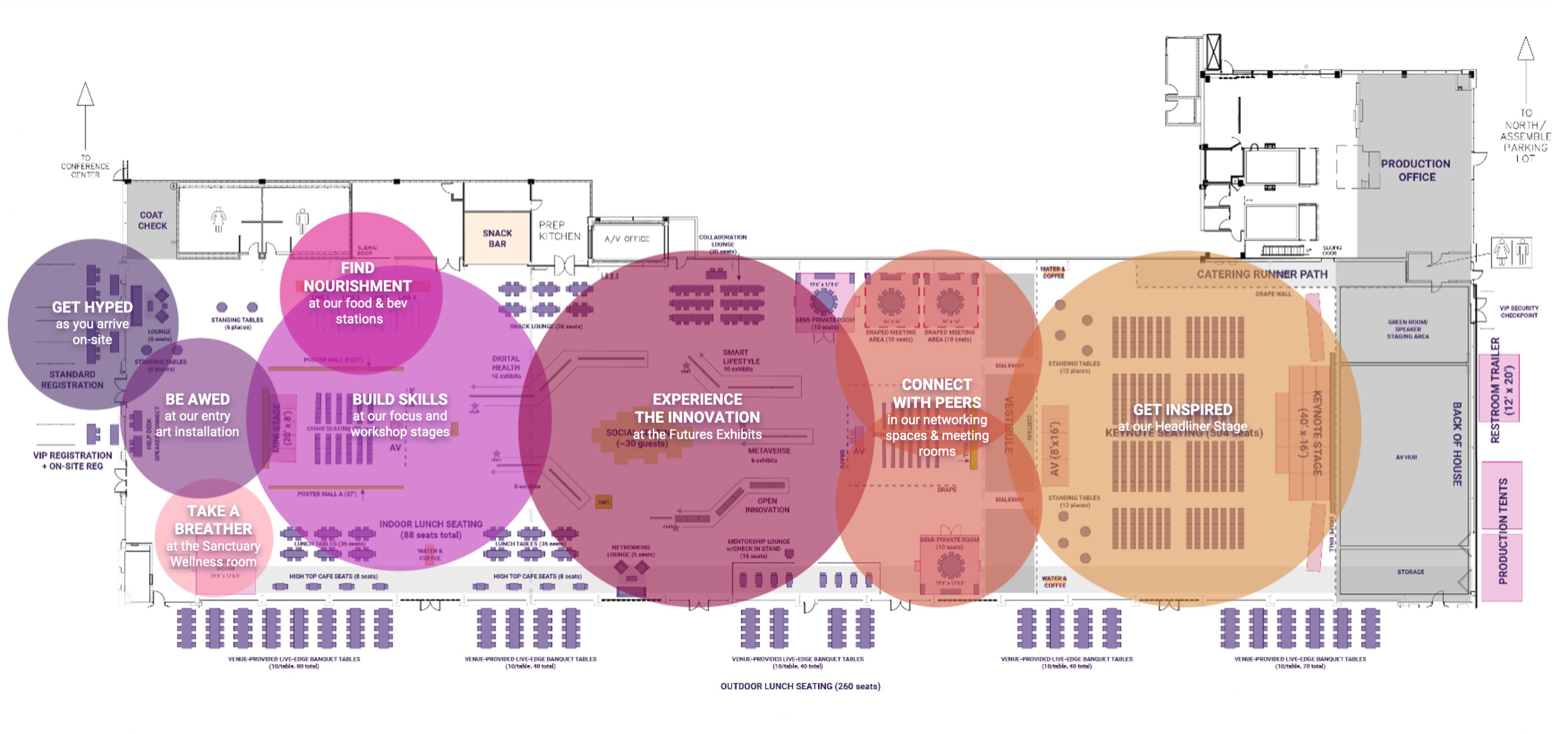 Pro tip: Map major story beats and experience moments to set the foundation of your floor plan. Balance pockets of engagement and energy with intimacy and rest to create a dynamic and sustainable experience.